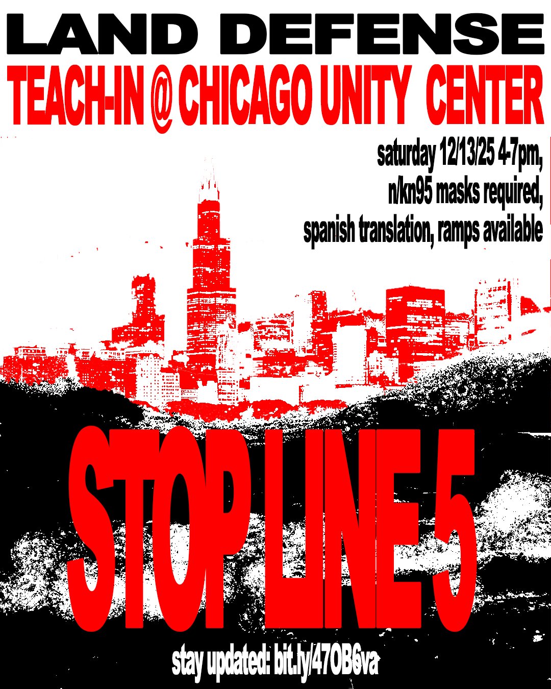 Unity Center 3339 S Halsted St, Chicago, ILJoin a broad coalition of autonomous organizers from Chicago for a teach-in. We will hear directly from land and water defenders in northern Wisconsin and Michigan on the latest push from Enbridge, and community efforts to organize resistance to stop, evict and remove Line 5.