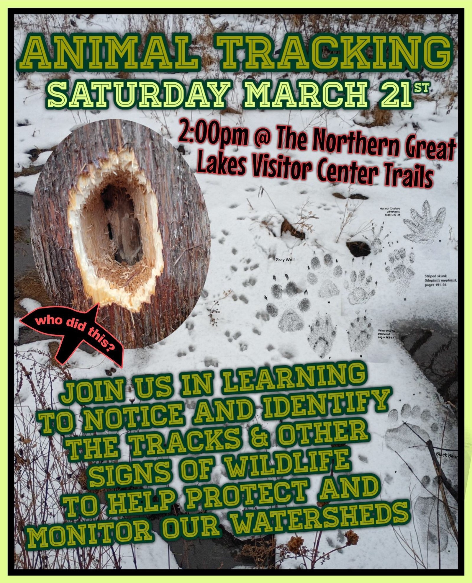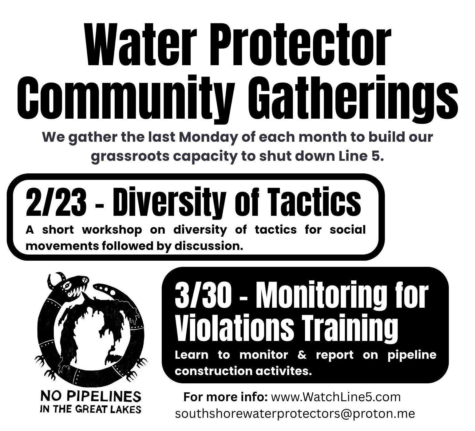 Join us in learning to notice and identify the tracks & other signs of wildlife to help protect and monitor our watersheds! Tracking is an important method for monitoring the impacts of the work that is starting to clear for the reroute of line 5. We are much more likely to see the tracks and […]