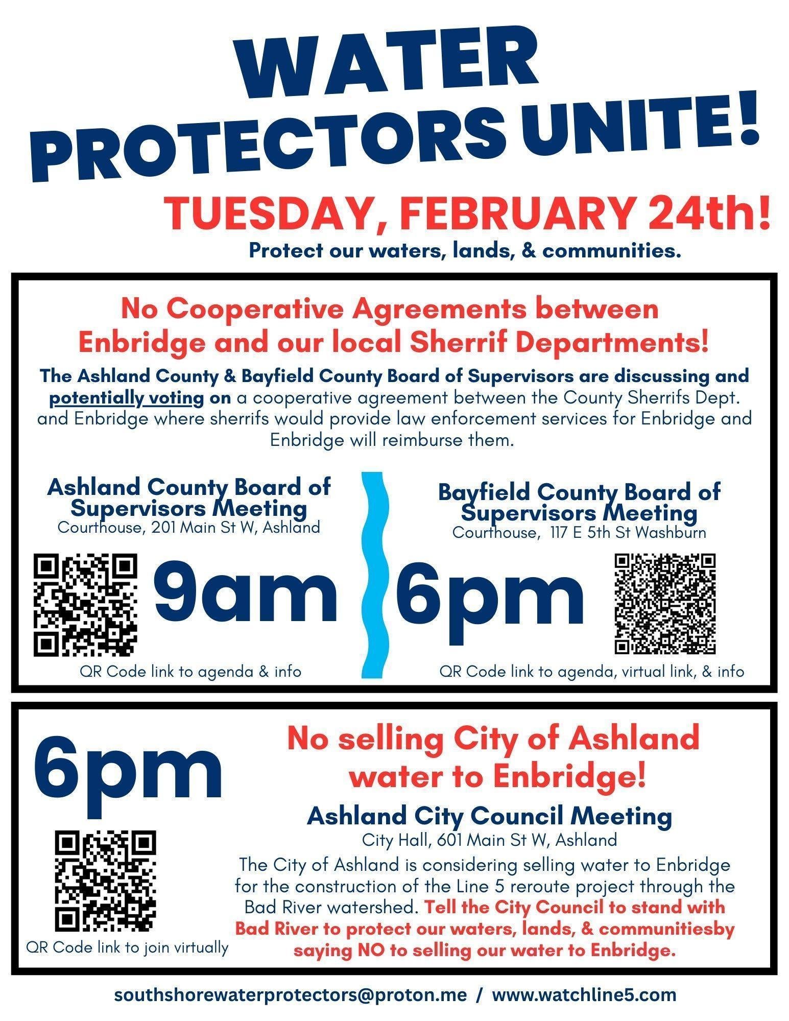 Tell Ashland and Bayfield County Board of Supervisors to say NO to Enbridge funding local law enforcement. Show up on Tuesday February 24th at 9am and 6pm.