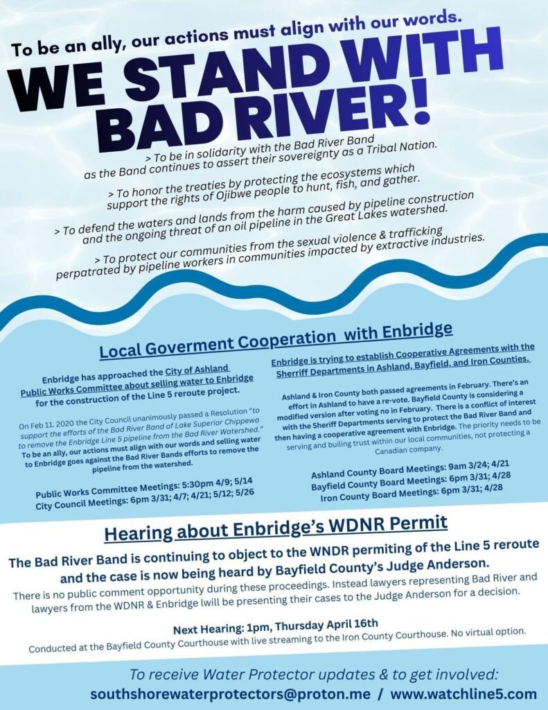 Enbridge is trying to establish Cooperative Agreements with the Sherriff Departments in Ashland, Bayfield, and Iron Counties. Ashland and Iron County both passed agreements in February. There’s an effort in Ashland to have a re-vote. Bayfield County is considering a modified version after voting no in February. There is a conflict of interest with teh Sheriff Departments serving to protect the Bad River Band and then having a cooperative agreement with Enbridge. The priority needs to be serving and building trust within our local communities, not protecting a Canadian company.